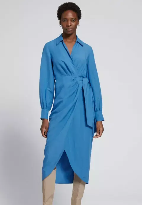 Modernes Hemdblusenkleid mit blauem Muster und einem schicken Bindegürtel – kann lässig oder elegant getragen werden, je nach Anlass.