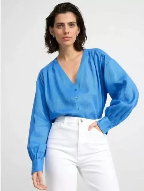 Lässige Leinenbluse mit V-Ausschnitt und langen Ärmeln. Perfekt zu angesagten weißen Jeans – zum Beispiel von Levi’s oder Closed.