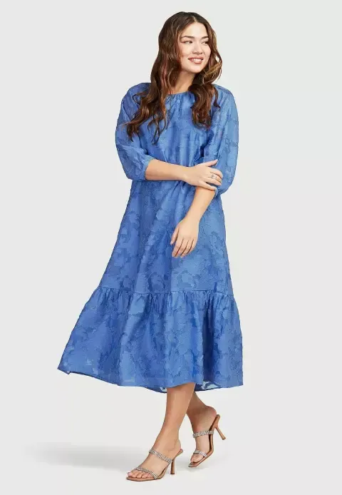 Jacquard-Kleid mit leicht gepufftem Ärmel und Volant am Saum – besonders schön zu weißen Sneakern.