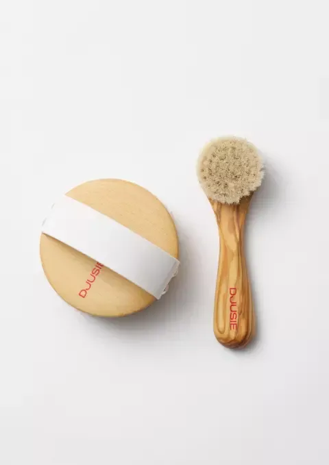 Die stylischen Trockenbürsten von Djusie (erhältlich etwa in Berliner Concept Stores oder online) sind für Gesicht und Körper konzipiert. Die Gesichtsbürste ist so geformt, dass sie jede Kontur erreicht und liegt angenehm in der Hand. Sie wird in Deutschland handgefertigt, besteht aus hochwertigem Ziegenhaar und hat einen Griff aus Olivenholz. Preislich liegen Sie mit aktuell 42,90 € (UVP) im oberen Segment – dafür ist sie langlebig und ein echter Hingucker in der Tageslicht-Badezimmerablage.