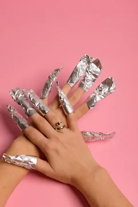 2. Bereiten Sie zehn kleine Stücke Alufolie und zehn Wattebällchen vor. Tränken Sie die Watte mit acetonhaltigem Entferner (Aceton gibt’s z.B. von essence oder ISANA Extra).