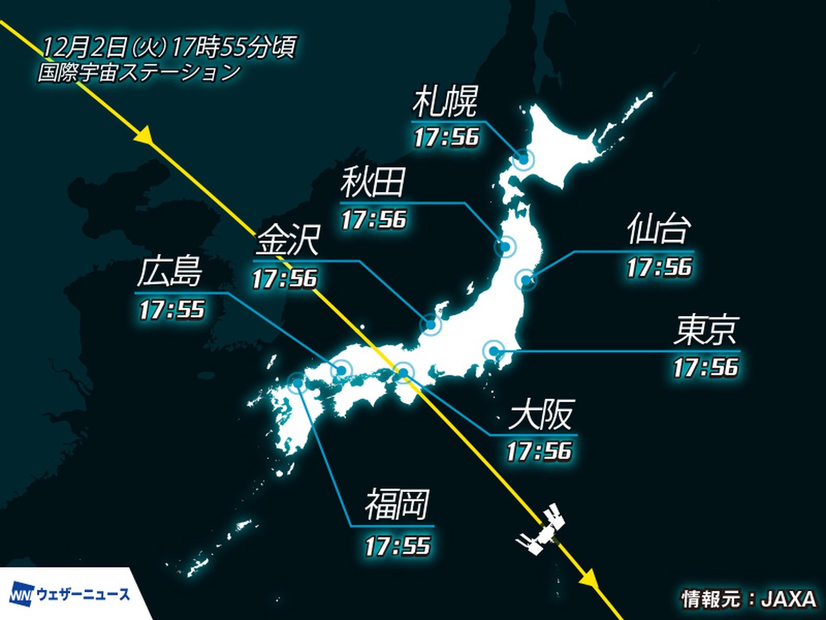 In Nordjapan und der Hokuriku-Region sind viele Wolken zu beobachten, was es leider schwierig macht, die Internationale Raumstation zu sehen. In der Kanto-Region, der San’in-Region und Teilen von Südkyushu gibt es zwar auch viele Wolken, jedoch könnten sich einige Lücken bilden, durch die man die ISS eventuell beobachten kann. In anderen Gebieten, einschließlich Tokai, sind die Wetterbedingungen generell klarer, was die Sichtung der ISS erleichtert.